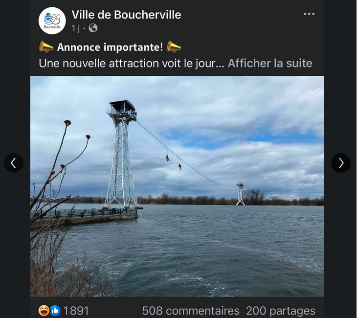 Après avoir tiqué sur le fait que deux villes québécoises avaient fait pratiquement la même blague de tyrolienne (voir image), le consultant a fait une petite recherche pour se rendre compte que des dizaines d’autres villes au Québec et dans le monde avait fait cette même blague. Des entreprises, dans un registre similaire, ont lancé un produit farfelu.