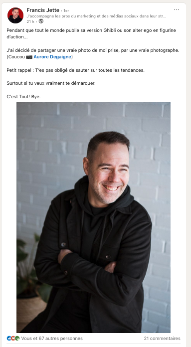 En guise de pied à ce flot de tendances LinkedIn, Francis Jette a décidé de publier un portrait souriant et lumineux, produit par une photographe professionnelle (Aurore Degaigne).