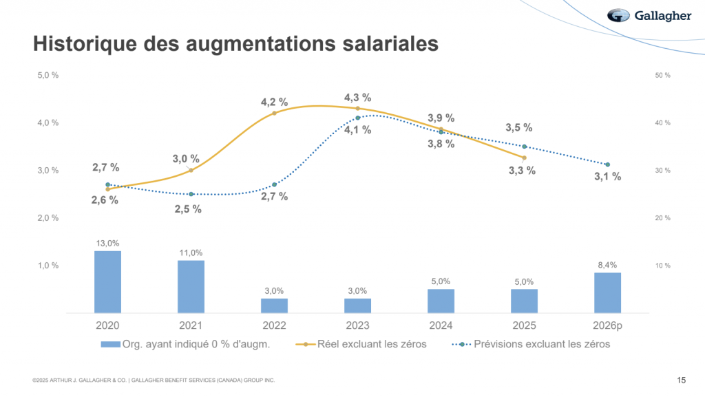 Sans surprise, les prévisions de Gallagher montrent la poursuite du déclin des augmentations salariales moyennes, excluant les gels : 3,1 % en 2026 contre 3,5% de 2025 et 3,8 % de 2024. Plus de 8 % des organisations n’ont pas prévu d’augmentation, un plus haut depuis 5 ans.