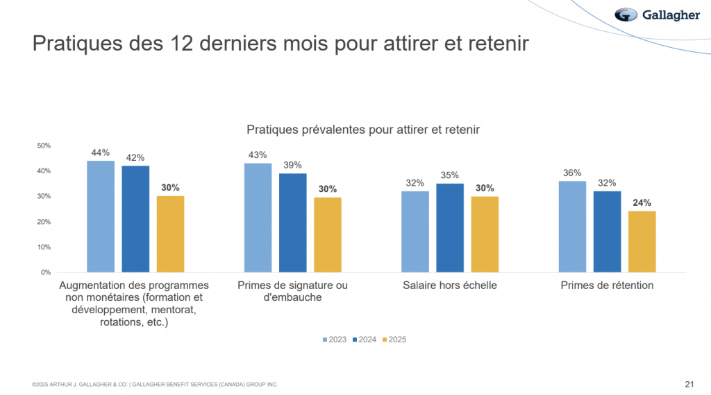 Autre signal illustrant cette tendance : les programmes non monétaires (formation, mentorat, développement, projets spéciaux, programmes de gestion de carrière) sont moins utilisés cette année (30 %) qu’en 2024 (42 %) et 2025 (42 %). Il en est de même pour les primes de signature ou d’embauche, les primes de rétention voire, à un degré moindre, les salaires hors échelle.