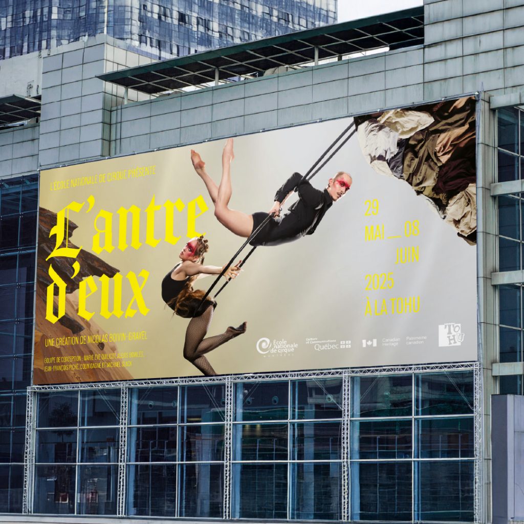 Le concept visuel met en scène des figures humaines en apesanteur, à la croisée de deux mondes – l’un plein, l’autre vide – incarnant le cirque comme territoire d’expression libre, totale et indisciplinée. Les contrastes de textures, la rupture chromatique et la typographie expressive amplifient cette tension créative, tout en recentrant le regard sur ce qui compte : le corps, le mouvement, l’élan.