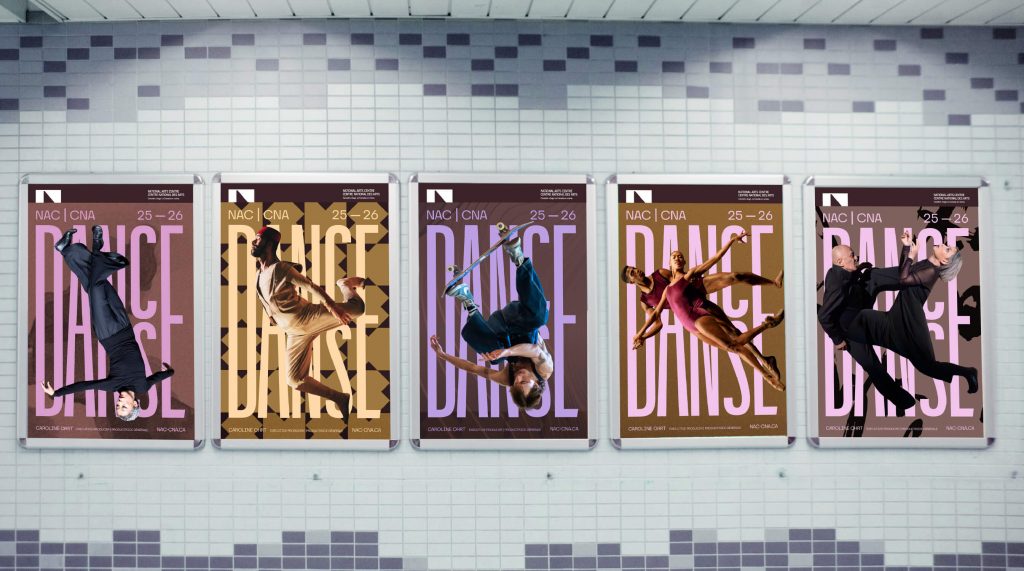 Pour répondre à ce défi, l’Agence Featuring a adopté une approche audacieuse et distinctive, visant à dépasser les représentations typiques de la danse. En intégrant des interprètes dans des positions dynamiques et inattendues sur des arrière-plans immersifs, l’agence a créé des visuels percutants qui captent l’attention. Le mot-symbole bilingue personnalisée, « NAC Dance | Danse CNA », combine harmonieusement les deux langues. Elle est aussi utilisée comme élément graphique derrière les images pour renforcer l’impact visuel.