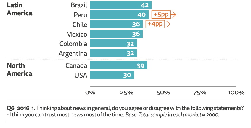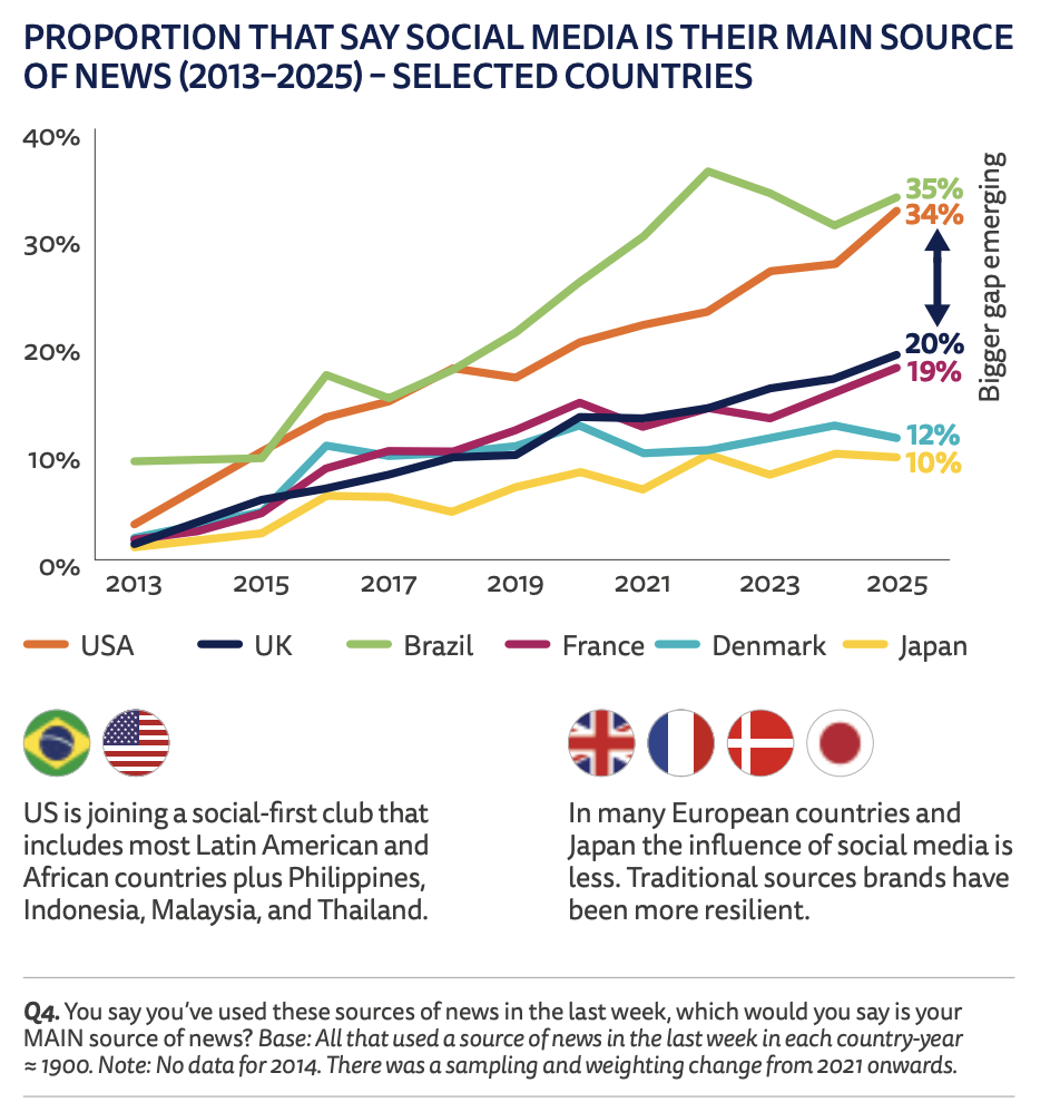 Dans certains pays comme le Brésil ou les États-Unis, les médias sociaux sont l’outil principal d’information pour plus d’un tiers de la population, alors qu’en Europe ou au Japon, la proportion dépasse à peine les 10 à 20 %.
