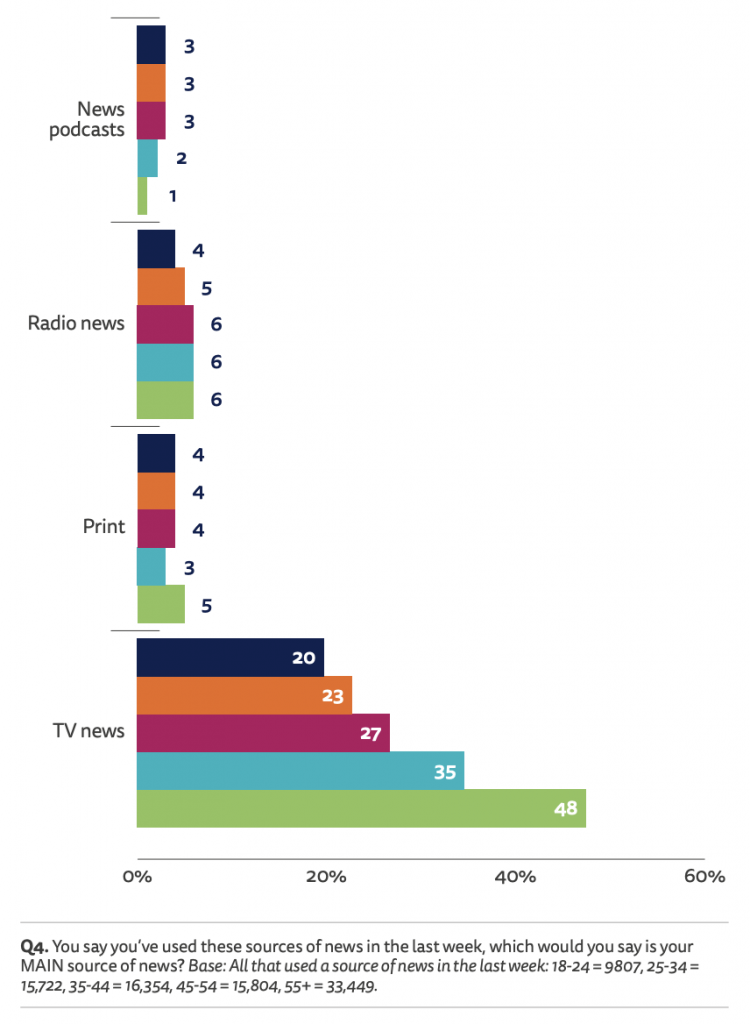 La bascule s’est faite sur une génération. Aujourd’hui, l’ensemble des moins de 35 ans s’informent principalement sur les médias sociaux devant les site des nouvelles ou la télévision (cf graphique ci-dessus).