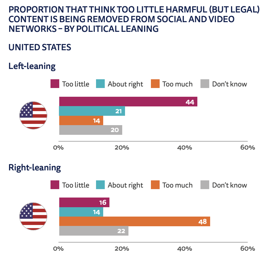 Un dernier graphique nous a particulièrement interpellé : la différence radicale de vision aux États-Unis sur la modération des réseaux sociaux selon le bord politique. Un pays coupé en deux.