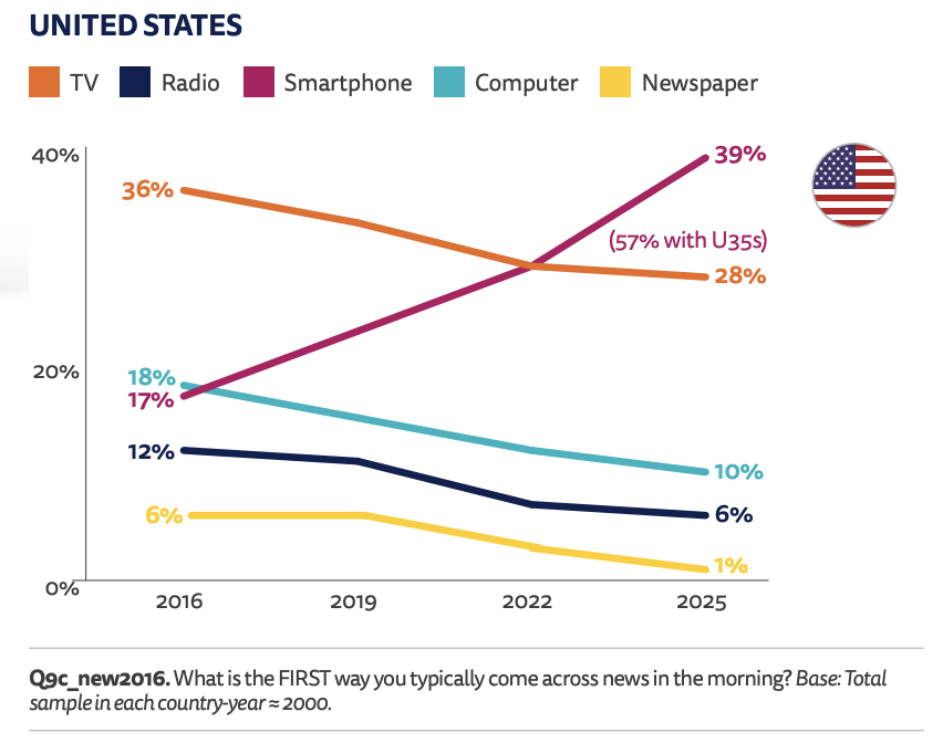 Autre donnée instructive : aux États-Unis (en ligne avec les autres pays), le premier réflexe pour s’informer le matin est aujourd’hui le cellulaire (39 % dont 57 % des moins de 35 ans). Relayant la radio (6 %), les journaux papier (1 %) voire l’ordinateur (10 %) loin derrière.