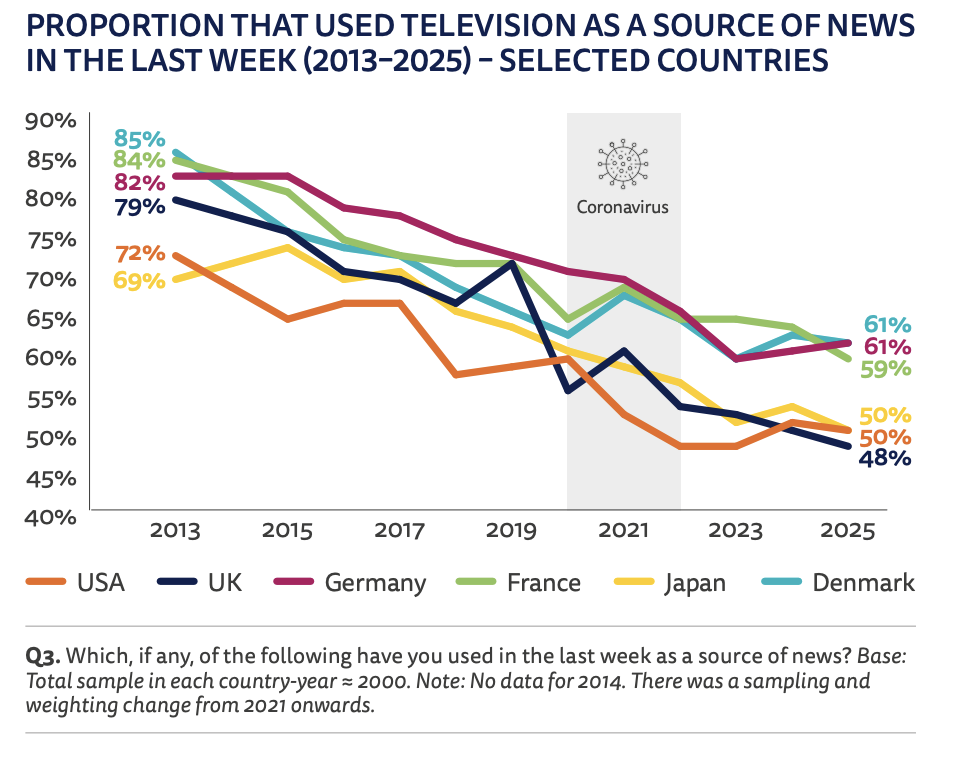 Corollaire inévitable des points précédents : le lent et inexorable déclin des médias traditionnels, à l’image de la télévision qui était le canal d’information chaque semaine de près de 80 % de l’Occident il y a encore une dizaine d’années. Las. Ce chiffre s’apprête à passer sous les 50 % aux États-Unis et au Japon et est à peine supérieur à 60 % en France et en Allemagne.