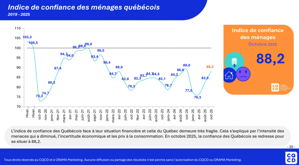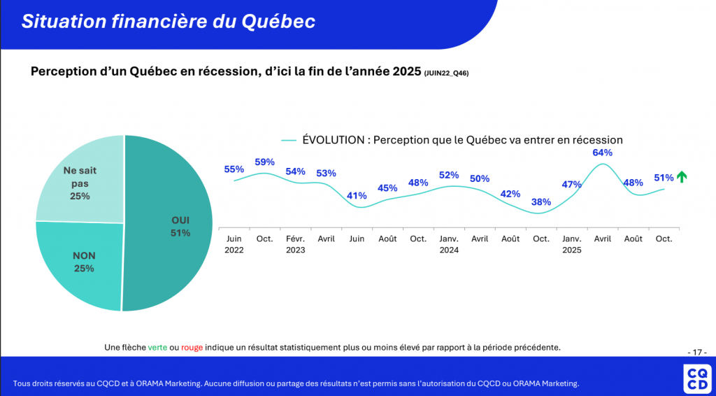 Cette amélioration contraste toutefois avec une perception encore fragile : 51 % des Québécois·es s’attendent à une récession d’ici la fin de 2025, et 74 % se disent inquiet·es face à l’avenir.