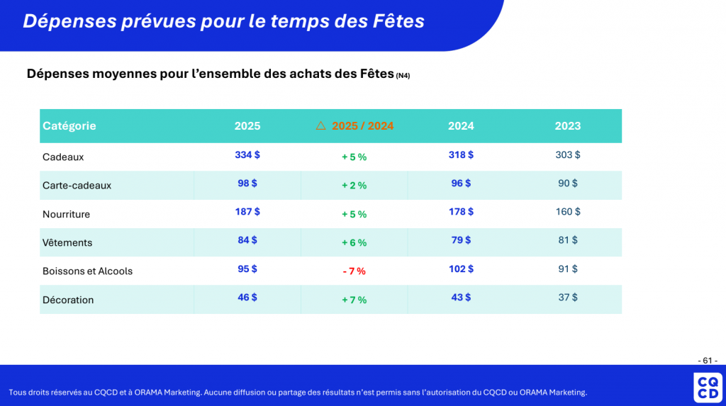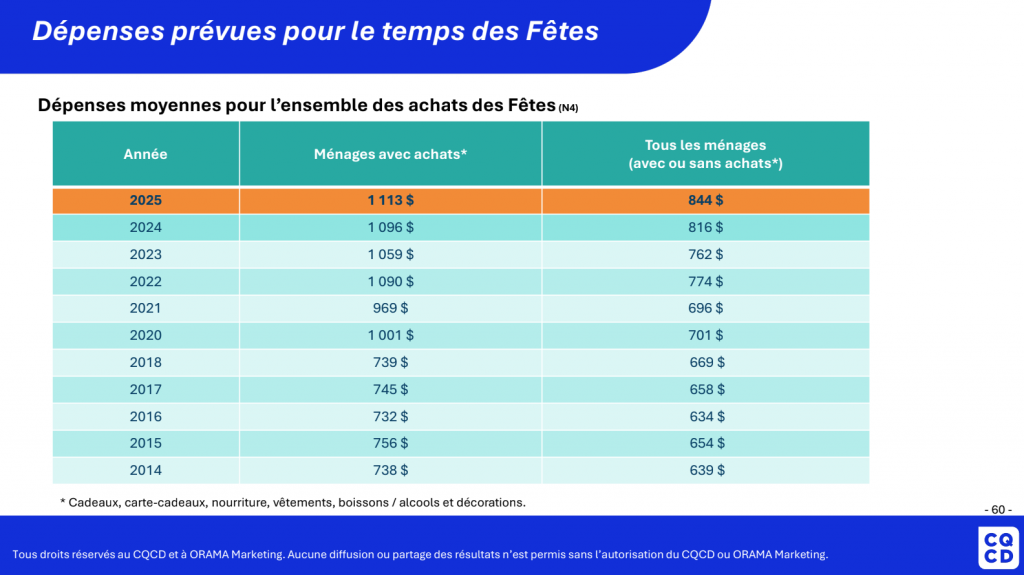 L’autre partie notable de l’étude concerne le temps des Fêtes. Avec un chiffre à retenir : 1 113 $. C’est ce que les ménages québécois prévoient de dépenser en moyenne pour les Fêtes, soit une hausse de 17 $ par rapport à 2024. Un montant qui tranche cependant avec le rapport du Conseil Canadien du commerce de détail qui indiquait pour sa part 620 $, soit le plus faible budget au Canada.