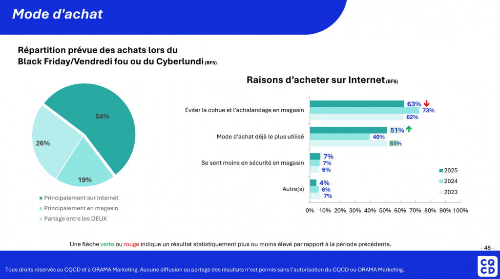 Alors que 53 % des Québécois·es prévoient faire des achats lors du Vendredi fou ou du Cyberlundi, 54 % d’entre eux comptent le faire principalement en ligne. Parmi les cyberacheteurs, 51 % font déjà la majorité de leurs achats sur Internet, un bond de 11 points en un an.