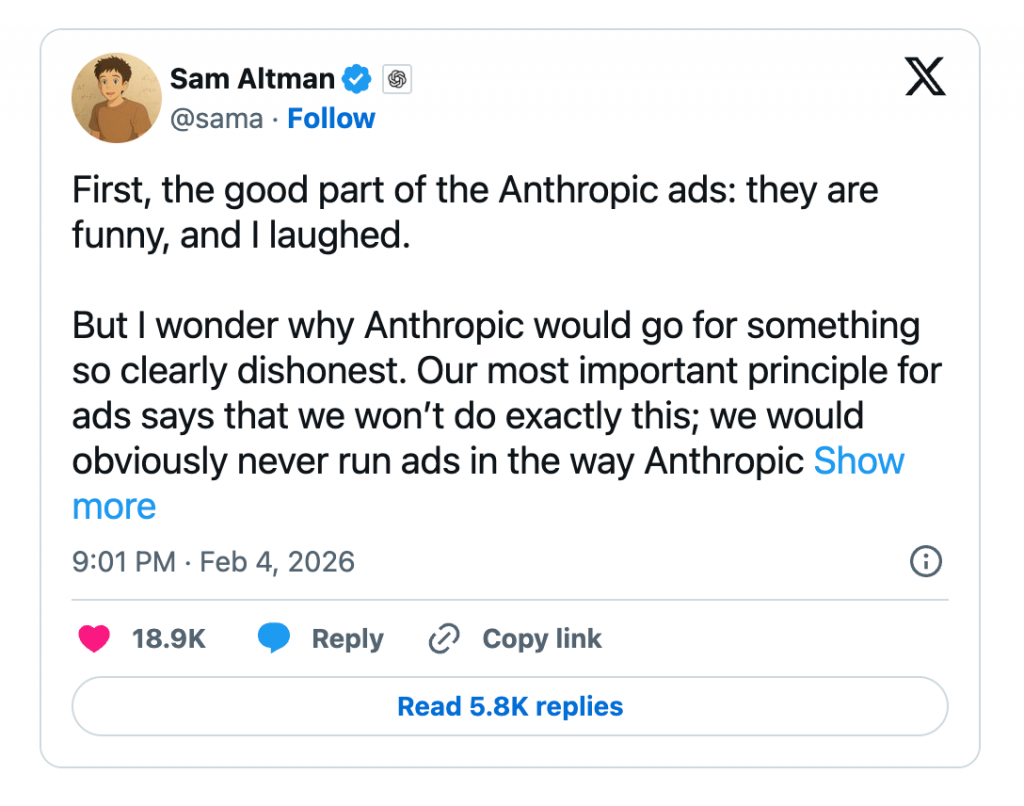 Mais c’est son principal concurrent, Anthropic, qui risque de beaucoup faire parler cette année. L’éditeur de Claude ne manque pas d’égratigner la firme de ChatGPT qui vient d’introduire la publicité aux Etats-Unis.