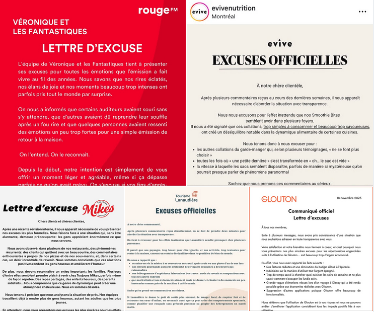 Rouge FM, Mikes, Tourisme Lanaudière et combien d’autres ont publié leur propre version de la fameuse lettre d’excuse, qui consiste à s’excuser d’avoir été trop bons ou trop bénéfiques envers ses clients.