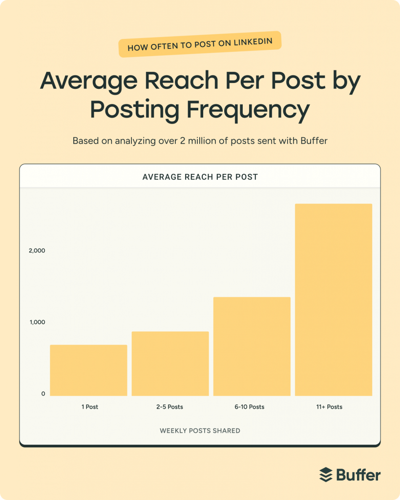 - More than 11 posts per week: +16,946 impressions per post and three times more engagement