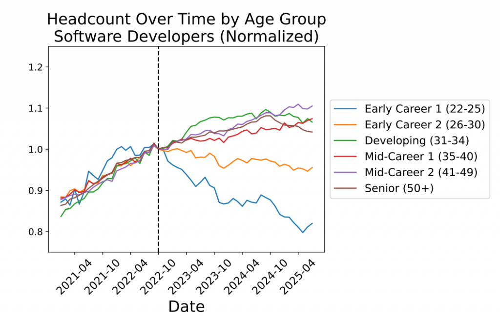 The other study, signed by Harvard researchers, reaches the same conclusion. It analyzed more distant data, going back to 2015. Result: from 2015 to mid-2022, junior and senior employment progressed steadily. But starting in 2022, junior employment began to stagnate then decline!