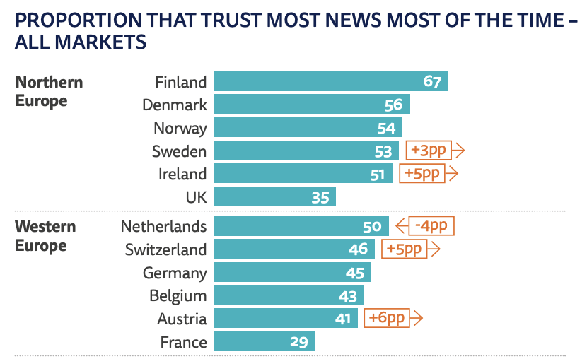 Another element scrutinized each year in the report: trust in media. For the third year, it’s stable at 40% globally. At 29%, France displays one of the lowest rates among the countries studied, just behind the United States (30%) while Scandinavian countries are at the top (Finland (67%), Denmark (56%), Norway (54%), Sweden (53%)). Canada is in between at 39%.